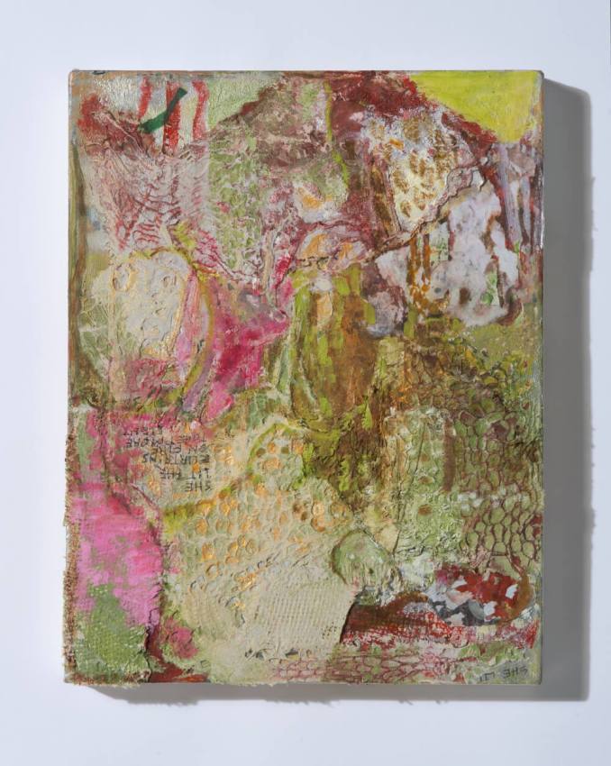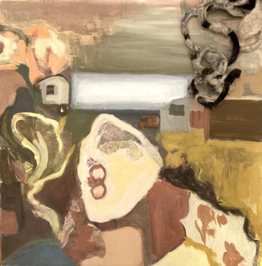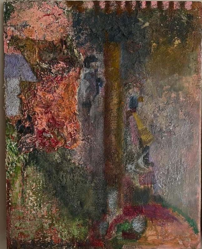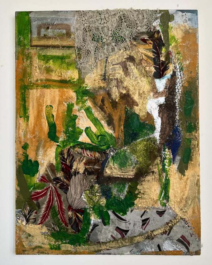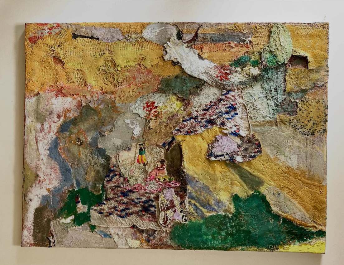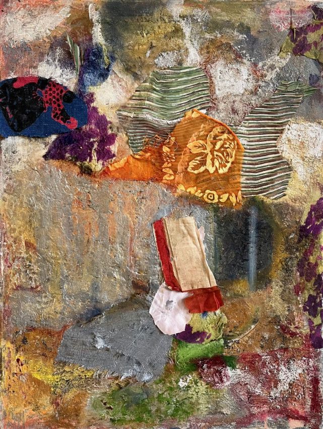 2025, mixed - textile paint, oil, paper, fabric on canvas, 18 x 24 inches