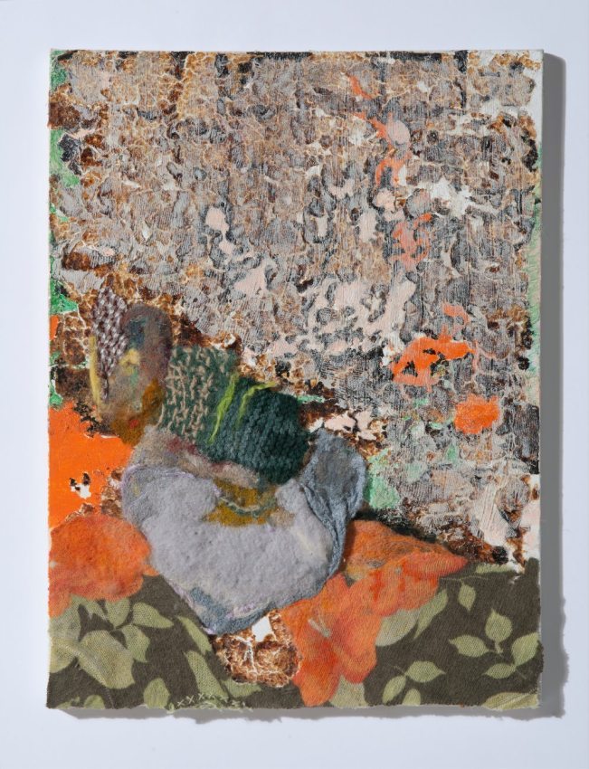 2025, mixed - flashe, sea weed, and fabric, 11 x 14 inches